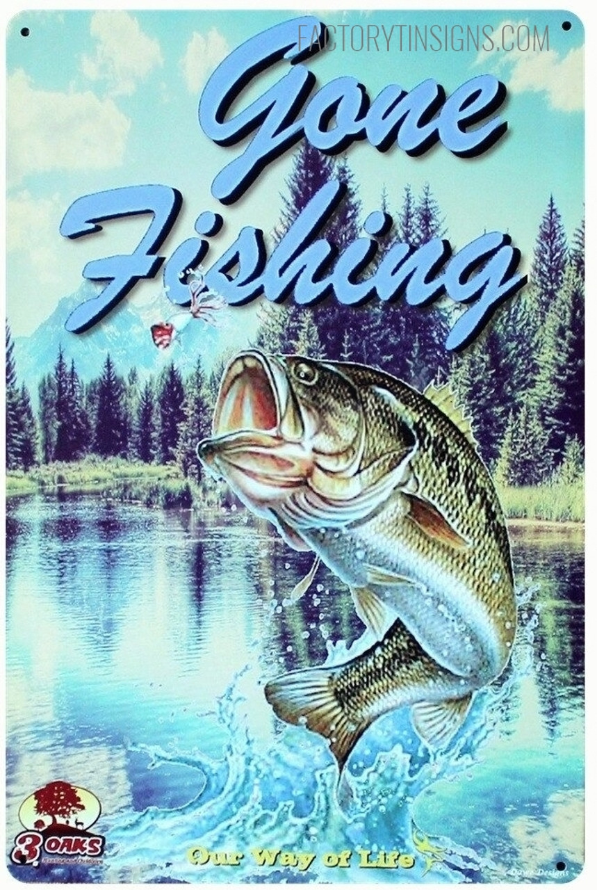 This affordable vintage metal sign captures a serene outdoor scene with a tree, sky, and river. A large fish is featured alongside the classic "Gone Fishing, One Way of Life" typography. It's an ideal retro plaque for home or living room decor, perfect for anyone who loves the outdoors and the tranquility of fishing.
