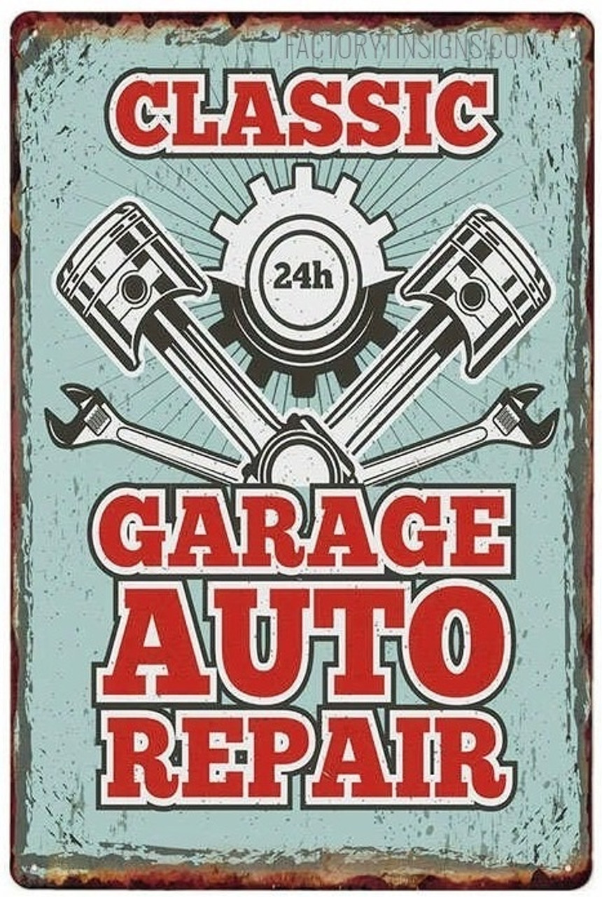 Bring classic garage vibes to your space with this vintage metal tin sign. Featuring a bold design with mechanic tools, "24h," and "classic garage auto repair" typography, it's the perfect wall plaque for any auto enthusiast. This cheap metal sign is ideal for adding a touch of retro flair and character to your workshop, man cave, or home.